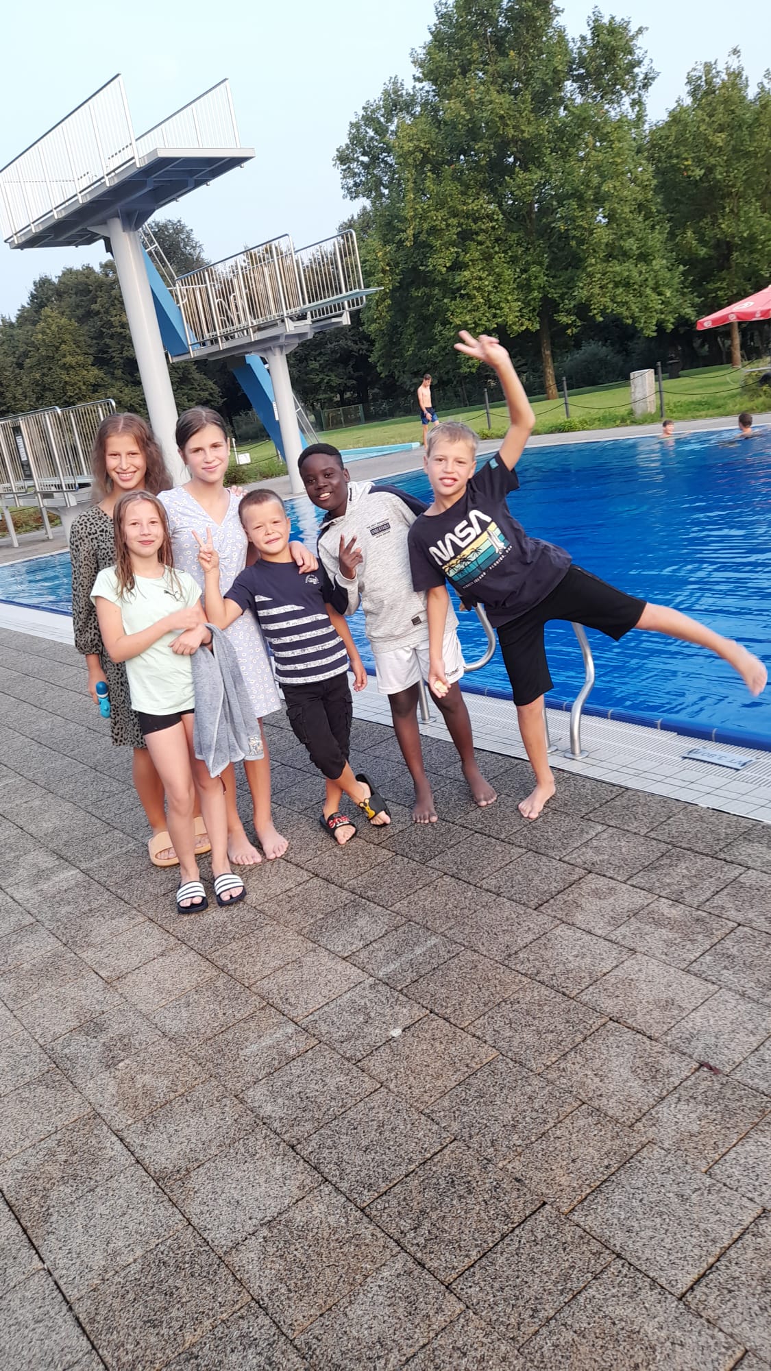 Aus einer anfänglichen Ferienaktion hat sich im Laufe der letzten beiden Jahre ein regelmäßiger Schwimmnachmittag an zwei Tagen in der Woche entwickelt. An einem Tag fahren die mittlerweile sicher schwimmenden Kinder in Begleitung mit dem Bus nach Münster ins Hallenbad, die kleinen Kinder, die noch nicht schwimmen können fahren an einem anderen Tag mit einer eins zu eins Betreuung ins Südbad um Spaß im Wasser zu haben und dabei nebenbei das Schwimmen zu lernen.